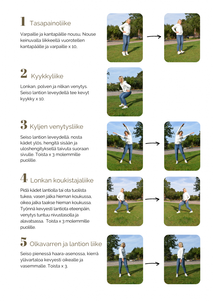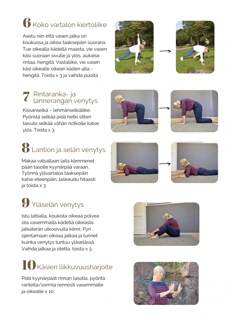 Näitä liikkeitä voi tehdä turvallisesti, ne ovat luonnollisten liikeratojen myötäileviä. Tee kaikki liikkeet omaan tahtiin. Älä ”runno” vaan tee liikkeet rauhallisesti. Tee näitä helppoja liikkeitä vähintään 3 kertaa viikossa ja vartalosi kiittää. Huomaat kuinka ryhti paranee ja hymykin irtoaa kuin itsestään.